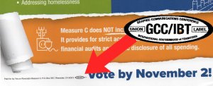 Above, you can see who received the job to print pamphlets the GCC/IBT a.k.a. the Teamsters! Next to the logo, you can find who is “Paid For by Yes on Measure C.” Just Google the Address: PO Box 7817, Riverside, CA 92513. Where does the Campaign for Yes On Measure C reside? LOL! The Riverside City Fire Fighters Association/ Union! Yep Protecting Life and Property, but not your Wallet! Wow! Isn’t Your Wallet Property?