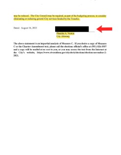 Here it is folks, the full “Impartial Analysis” by our new City Attorney Phaedra Norton, and I can tell you she is one shyster! Of course it is priceless. The first statement she makes is the following: The Charter Amendment would continue the transfer of revenue from the City’s electric utility fund to the City’s general fund for the purpose of maintaining general city services such as 9-1-1 response, fire, paramedic, police (LOL, actually some of the City Council members actually want to defund the police), street repairs (LOL, how many pot holes did you hit just going to the grocery store?), Parks (Look at how they have been maintained), Senior Services(when have they ever cared about Seniors, Only Their Vote.), Addressing Homelessness (Remember, Homeless People aren’t taxpayers) and other General Services, which lax to begin with. All lies folks. She didn’t even sign the letter, that’s why they redacted it. Who does that? Of course, The City of Riverside Cartel always have something to hide!