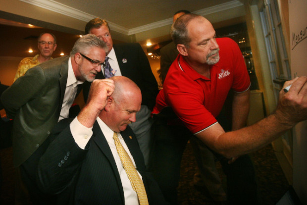 The picture below shows the RUSD Board Member and Fire Union and all together having a good time after the passing of Measure A back in 2013! Tim Strack, president of the Riverside City Firefighter in center, raises his fist as the first results of Measure A came in, at the Orange Crest Club in Riverside, at left, Tom Hunt of the school board and writing in the totals is Dave Austin, on Tuesday, June 4, 2013.