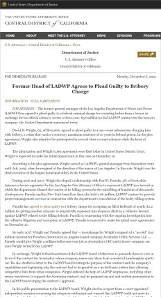 Re: “Wright admitted to other corrupt schemes while at LADWP”: Hopefully investigators are looking at all management level staff that came from Riverside Public Utilities to work for LADWP and/or represented either city in SCPPA during his employments. Especially those that left LADWP after Dave Wright resigned.