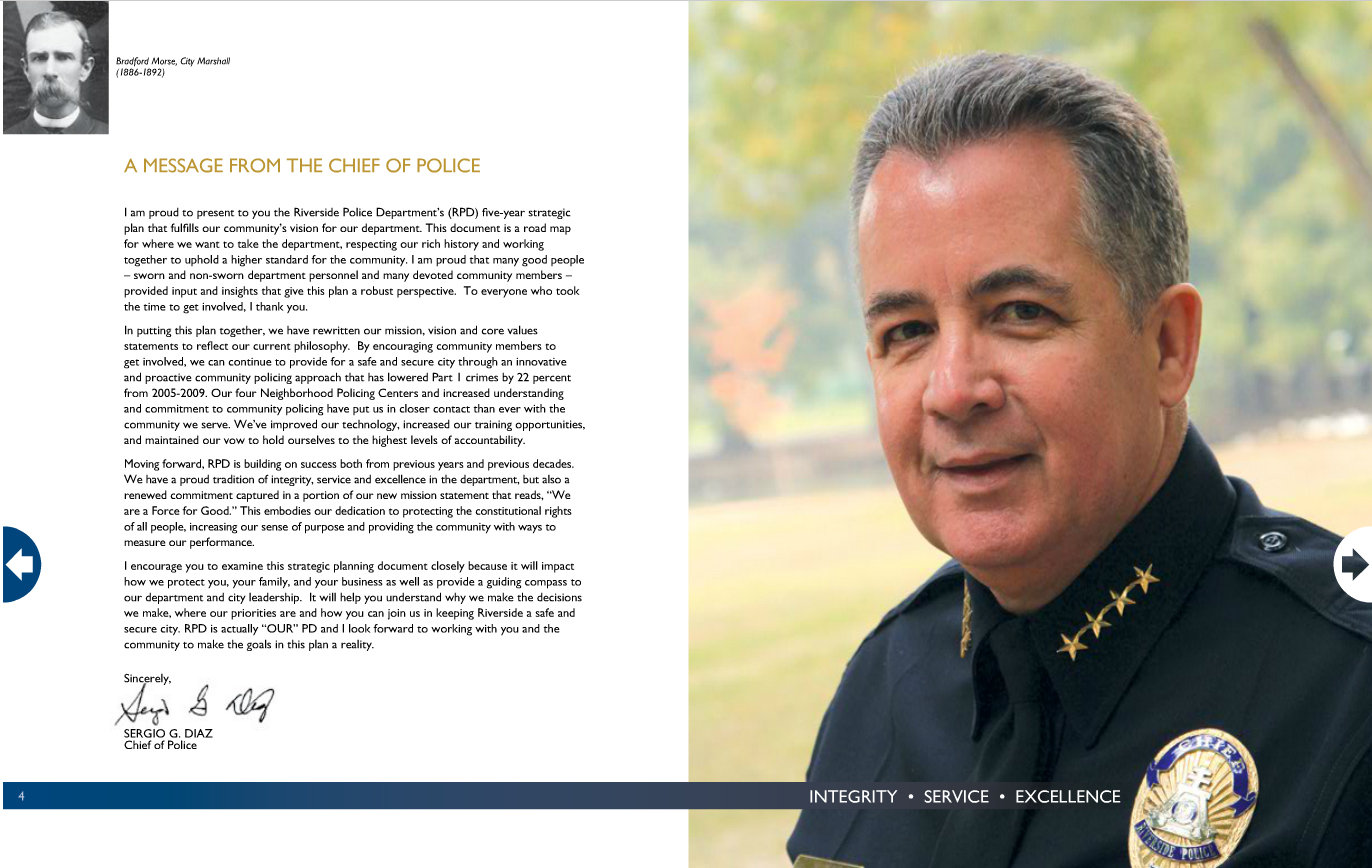 At Tuesday’s City Council Meeting Chief of Police Sergio Diaz with Assistant Police Chief Chris Vicino presented the Police Departments Strategic Plan for 2010-2015 just prior to the display of unchiefly behavior everyone is talking about.  But wait a minute or two,  2010?  Wasn’t that two years ago.  Isn’t this just a little late in turning in this chiefly assignment? How do you retroact two years..?  So, shouldn’t it read 2012-2015?  Regardless here it is.