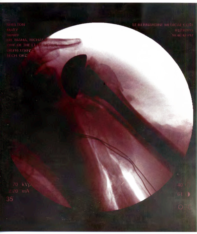RIVERSIDE’S OWN FIVE BEFORE MIDNIGHT BLOGGER MARY SHELTON BREAKS HER SHOULDER IN A FALL ON A CITY CURVE. Her surgery on Tuesday the 29th exposed what was seen as a shoulder bone which was badly crushed to the point of no repair. Her shoulder bone was rebuilt with the use of a prosthetic titanium insertion which will replace the bone lost as seen in the x-ray.