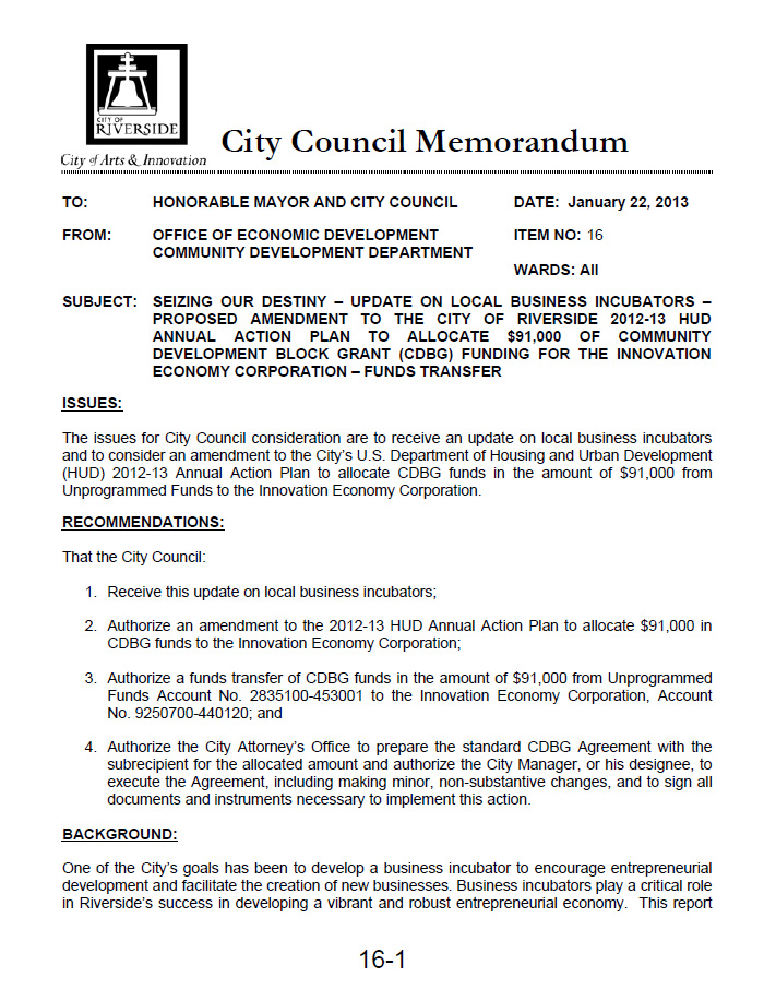 CDBG MONIES USED FOR INCUBATOR COMPANIES, ONE OF WHICH WENT DEBUNK.. Giving Federal CDBG monies to incubator companies, is that legal? Even though many at public comment asked that it be removed from the consent calender for more discussion, City Council unanimously voted on it. Even Councilman Paul Davis and Councilman Andy Melendrez who appeared most concerned about and questioned the funds use voted on it. This was item #16 on the Consent Calender for January 22, 2013. CDBG funding requires citizen participation, nowhere found on the document. So, what our CDBG funds and what should they actually be allocated for? Well, let’s start with the following.