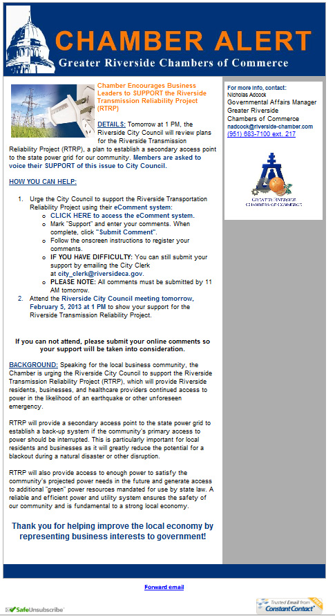 According to the Press Enterprise, on Monday, Jan. 14, Jurupa Valley Chamber of Commerce President Dan Rodriguez met with Riverside Mayor William “Rusty” Bailey to discuss how the Interstate 15 route would impact commercial, industrial and residential development that would bring jobs, tax revenue and valuable services to Jurupa Valley. Chamber director Ron Anderson and Jurupa Valley council members Laura Roughton and Frank Johnston also attended the meeting. In a memo to Bailey, Rodriguez warned that “this project would eliminate approximately 806 homes in the city of Jurupa Valley, which will affect the local school district and eliminate future customers for businesses …” TMC was also told that the transmission route would cut through land considered prime realestate. Jurupa Valley Councilman Frank Johnston described the meeting as “disappointing, but not surprising.” This is reference to the collaboration with Riverside Mayor Rusty Bailey.