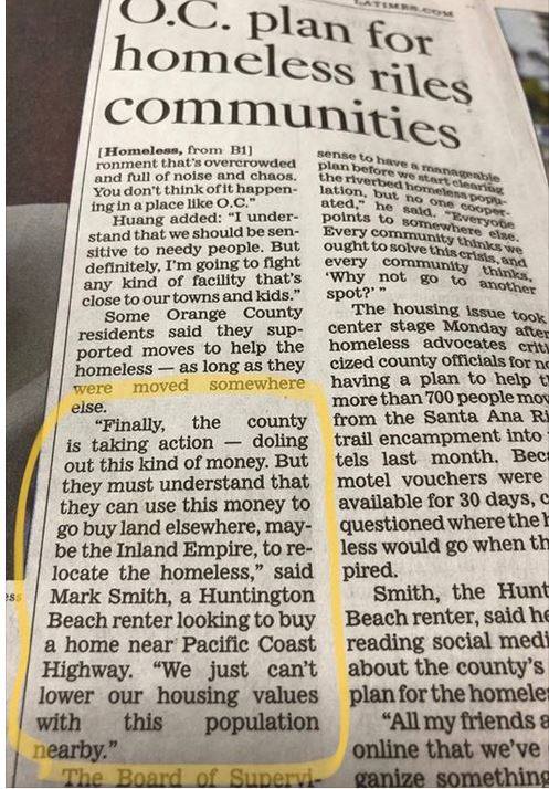 As reported in the LA Times @ Tuesday’s Orange County Supervisors Board meeting , Huntington beach resident Mark Smith suggested that Orange County Money should be used to move homeless to areas like the Inland Empire, the ‘Land of the Dirt People’ as described by some. We thought we were elevated to the term ‘Hillbillies’ as inferred by one Riverside City Councilman Mike Soubirous.