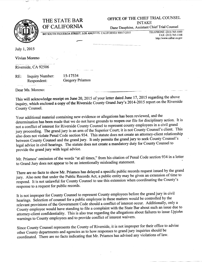 Hackert states that it is not misconduct for Mr. Priamos to ask County employees to advise his office of contacts from the grand jury, since they may be entitled to legal representation under Penal Code section 939.22. Penal Code section 939.22 states that any witness called to give testimony under oath before a civil grand jury may have counsel present on his or her behalf while he or she is testifying. The difference, is that Priamos was demanding that employees contact him if called by the grand jury. Thus violating penal code section 939.22 by not allowing an employee to choose their own attorney. But again, it’s evident by their response, that the State Bar isn’t there to protect the consumer or taxpayers, but to protect themselves. We see this time and time again. The State Bar is not there to protect the public, since their primary activity lobbying, and have already paid dearly in campaign contributions to protect their own, before they protect the public.