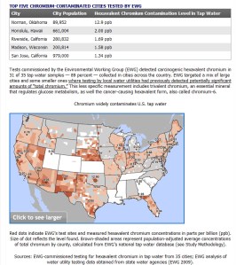 The question which has not been quite answered, is has the plume hit the drinking water aquafiers to the extent of concerned levels? According to Riverside Public Utilites water quality report of 2011, hexavalent chromium ranged from 1.9 parts per billion to 2.7 parts per billion, all in acceptable levels for drinking water. So how much Hexavalent Chromium is necessary for someone to come down with cancer? At this time the answer is unknown. The EWG (Environmental Working Group), initiated by Erin Brockovich, is now pushing to reduce California’s hexavalent chromium limit down to 0.06 parts per billion. In this scenario, making a case of levels of hexavalent chromium contaminant in water in relation to cases of related cancer, won’t be necessary. Therefore, if she is successful, Los Angeles, San Jose, Sacramento and Riverside would be targets of her litigation team. If the State levels of hexavalent chromium were to drop to 0.06 part per billion, the City of Riverside would be third on the list on the top five chromium contaminated cities.